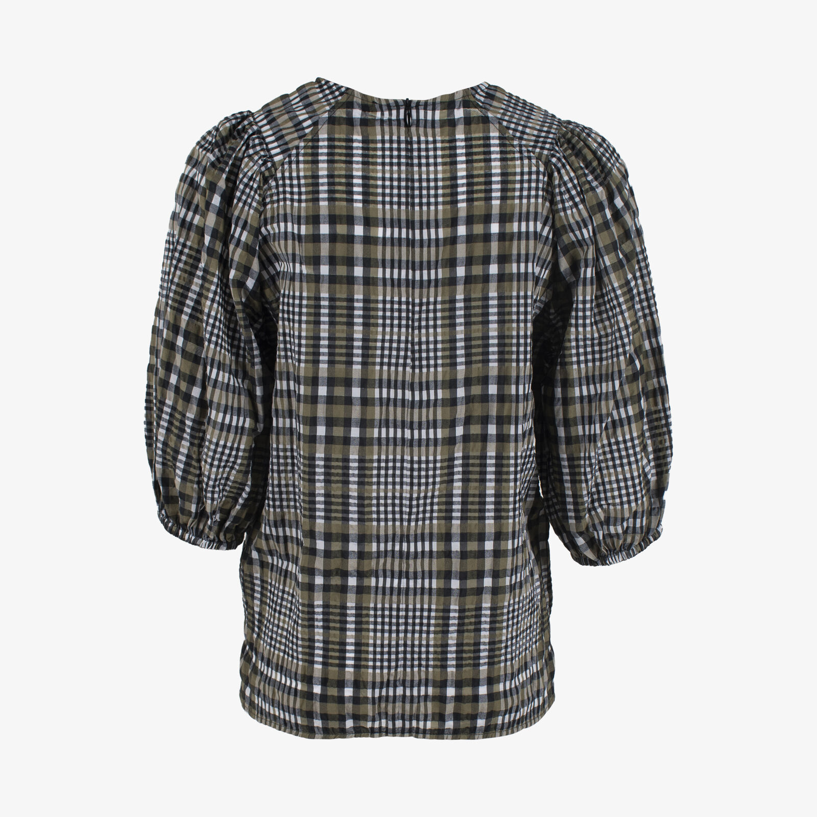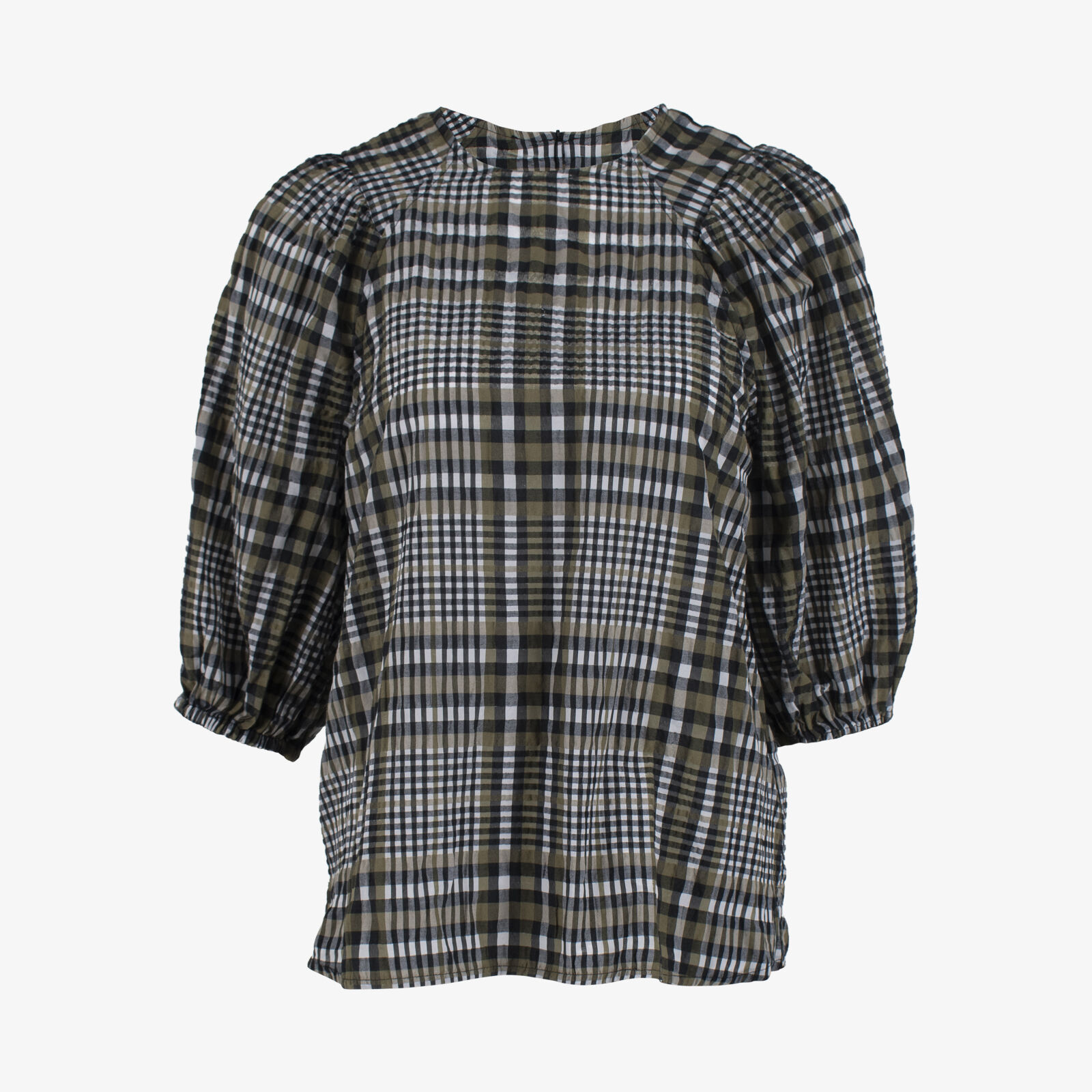 Ganni Check Puff Sleeve Seersucker Top